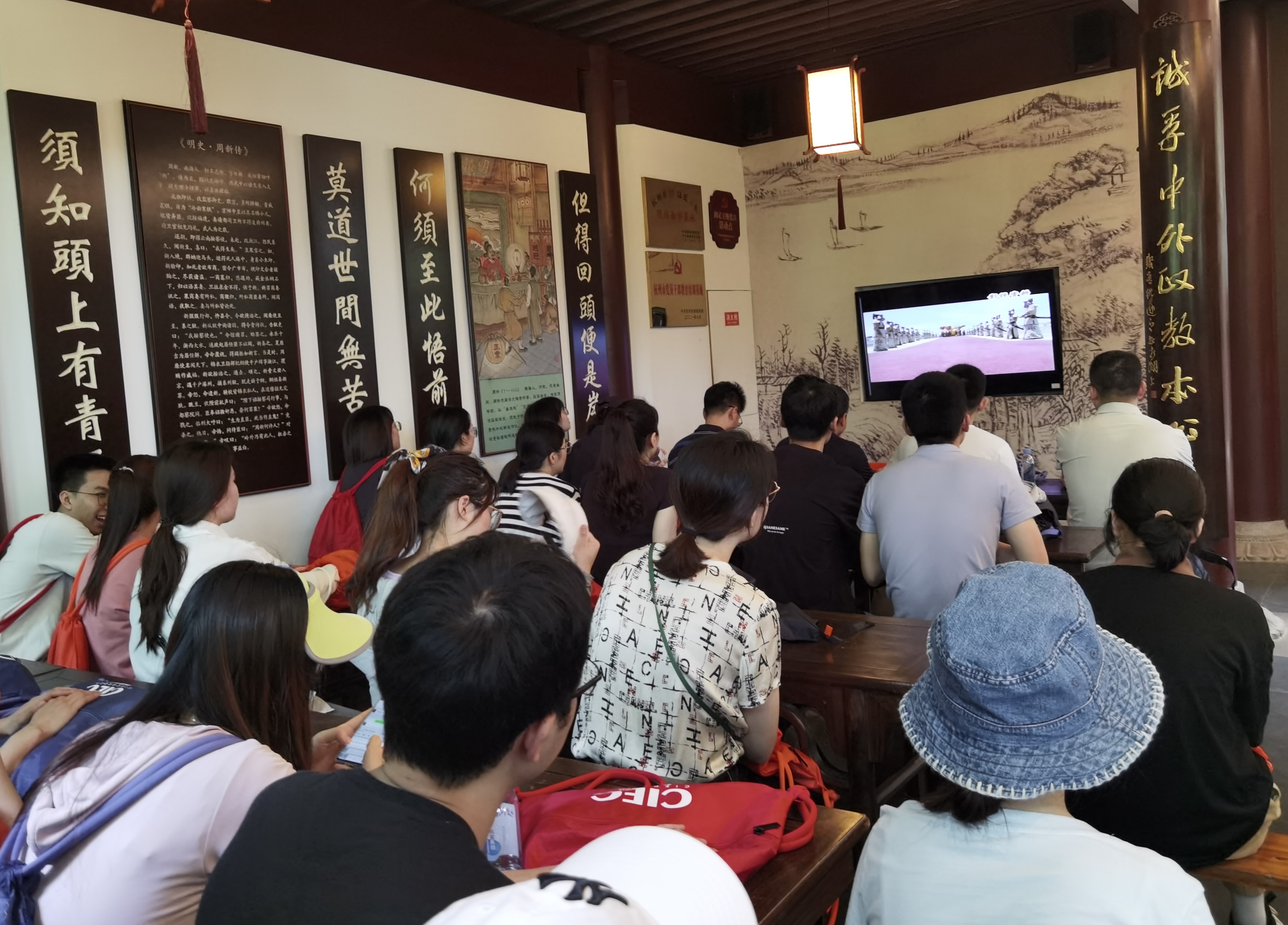 在仪门廉政宣教厅,党员们诵读了梅挚所作警醒官员行为的《五瘴说》、参观了周新祠塑像、观看了《铁面无私周新》的宣传片,感受到了众多历史人物“清风两袖朝天去,正气一生为民忙”的气概。